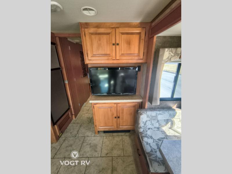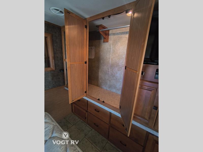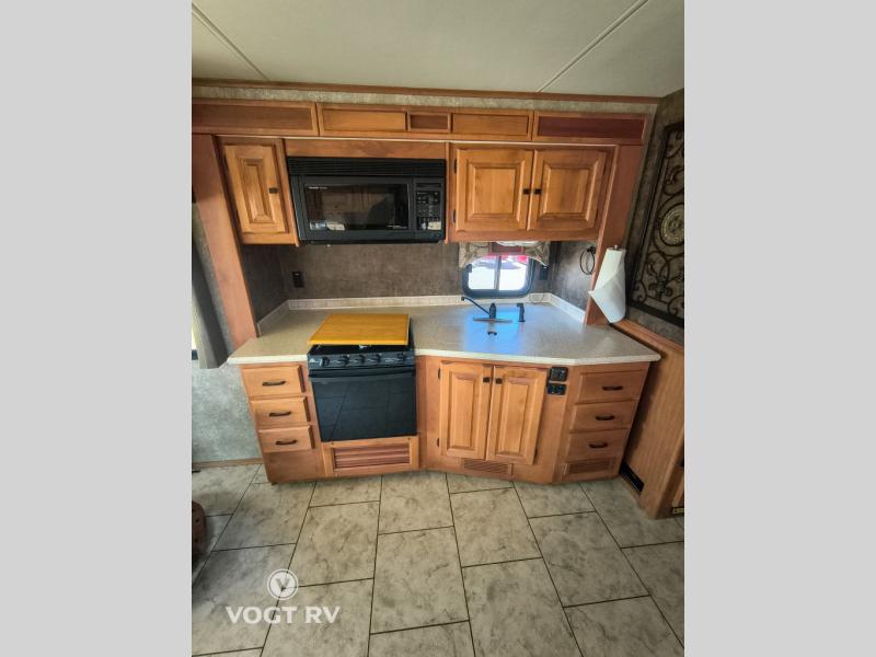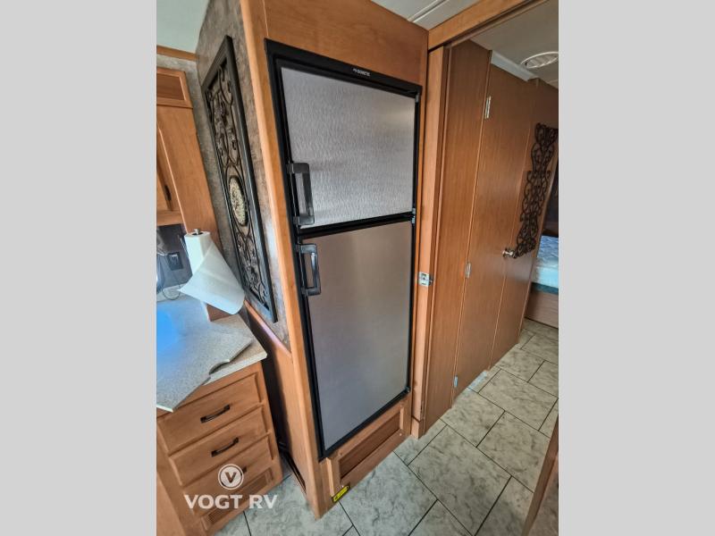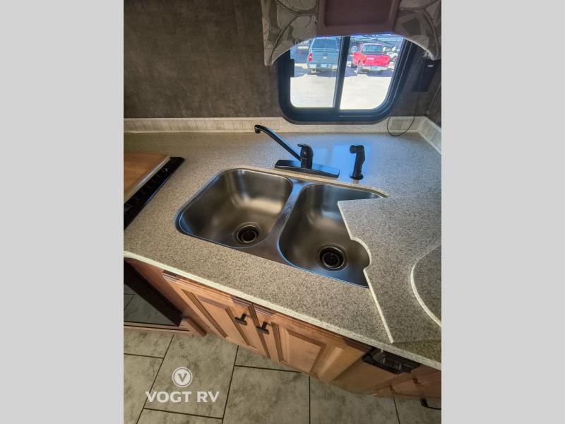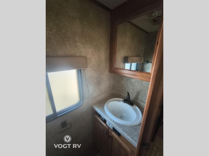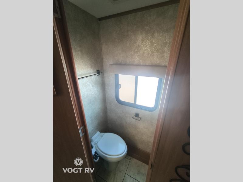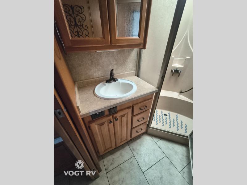 Inside, you’ll find a spacious, residential-style interior with quality cabinetry, comfortable seating, and an open living area that’s perfect for long trips or extended stays. The well-designed kitchen provides ample counter space and storage, making meal prep on the road simple and convenient. The private bedroom offers a relaxing retreat at the end of the day, while the split bathroom layout adds functionality for couples or guests.