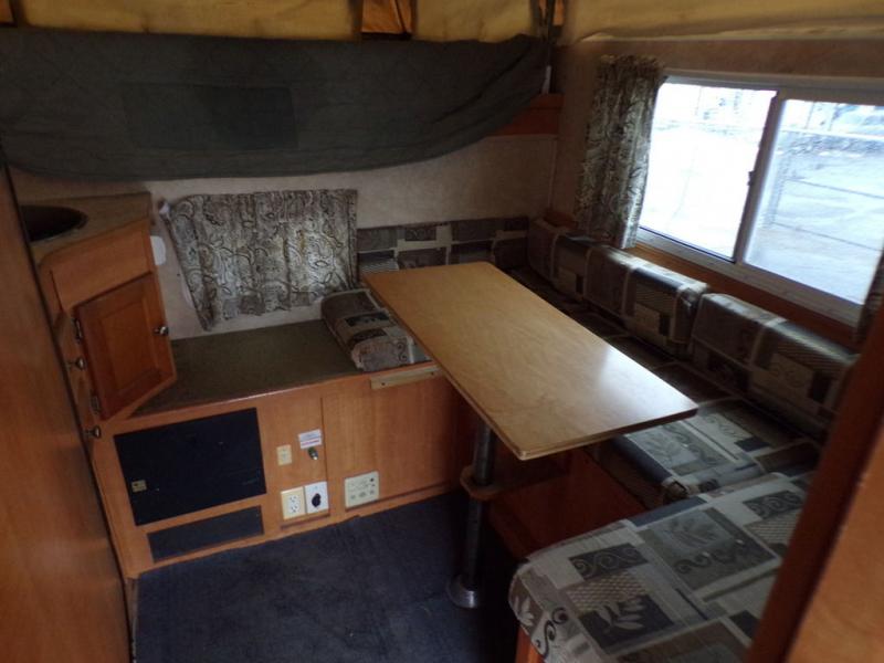 Travel Lite Pop-Up 875 Series Truck Camper w/Rear Entry Door, Storage Shelves, Wardrobe, 3 Cu. Ft. Refrigerator, 2 Burner Cooktop, Kitchen Sink, Wet Bath w/Toilet & Shower, Dinette/Bed w/Table, Step Up to Front Queen Bed w/5' Under Bed Storage and More!