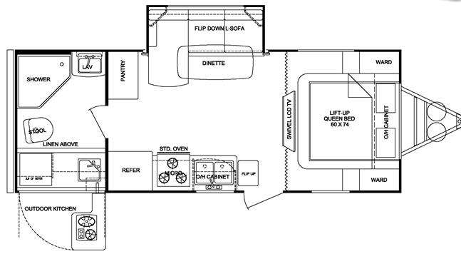 Fun Finder X Travel Trailer by Cruiser w/Rear Corner Bath Including Angle Shower, Sink & Toilet & Linen Cabinet Above Rear Corner Exterior Kitchen w/Refrigerator, Sink & Swivel Out Cooktop, Pantry, Flip-Down Sofa Slide w/Table & Overhead Corner Shelves, Refrigerator, 3 Burner Range, Dbl. Kitchen Sink, Overhead Cabinet, Swivel LCD TV, Front Lift-Up Queen Bed, Wardrobes Both Sides of Bed and More!