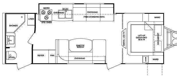 Single Slide Cruiser Fun Finder X Travel Trailer w/Rear Full Bath w/Private Entry Including Angle Shower, Linen Cabinet, Sink & Toilet, Refrigerator, Pantry, U-Dinette Slide w/Overhead Cabinet, 3 Burner Range w/Microwave Above, Dbl. Kitchen Sink, Free Standing Sofa w/Overhead, Swivel LCD TV for Bedroom & Living Area Viewing, Lift Up Queen Bed in Front w/Wardrobes Both Sides of Bed and Much More!