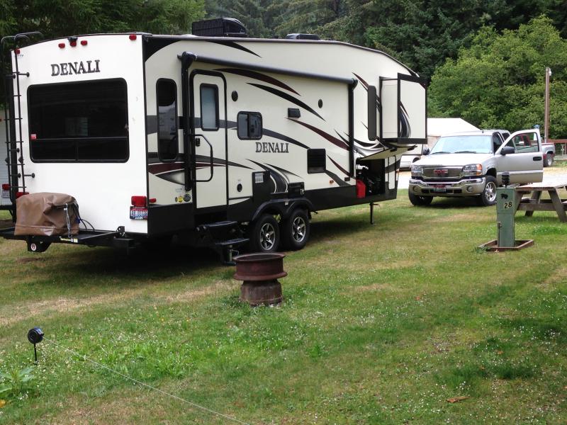 AS ISDutchmen Denali Fifth Wheel w/Rear Living Area Including 2 Lounge Chairs w/Table Between & Overhead Cabinets, Air Mattress Sofa & Oversized U-Shaped Dinette Slide, Dbl. Kitchen Sink, 3 Burner Range w/Microwave, Refrigerator, Pantry, Corner Linen Cabinet, Step Up to Side Aisle Bath w/Angle Shower, Toilet & Sink, Front Queen Bed w/Wardrobe & Shirt Closet/Nightstand, Sliding Larger Wardrobe and Much More!