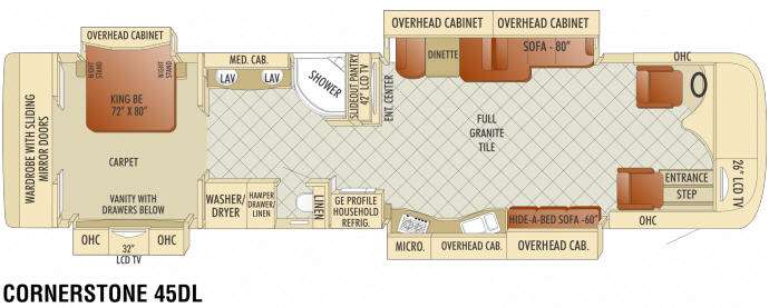 Quad Slide Cornerstone Class A Diesel, Rear King Bed Slide Out w/Nightstands, Wall Ward. w/Mirror Doors, Vanity w/Drawers & 32" LCD TV Slide Out, Dbl. Lav. w/Med. Cab., Corner Shower, Washer/Dryer Prep., Hamper Drawer, Linen, Private Toilet Area, Slideout Pantry, 42" LCD TV/Ent. Ctr., GE Profile Household Refrig., 3 Burner Range/Micro./Dbl. Sink/Hide-A-Bed Slide Out, Booth Dinette & Sofa Slide Out, Overcab 26" LCD TV, Overhead Cab. Throughout & More.