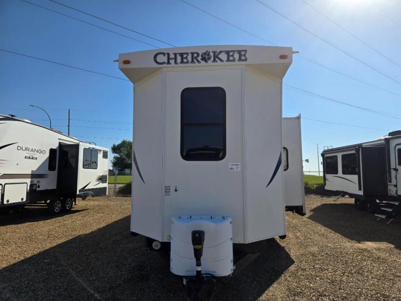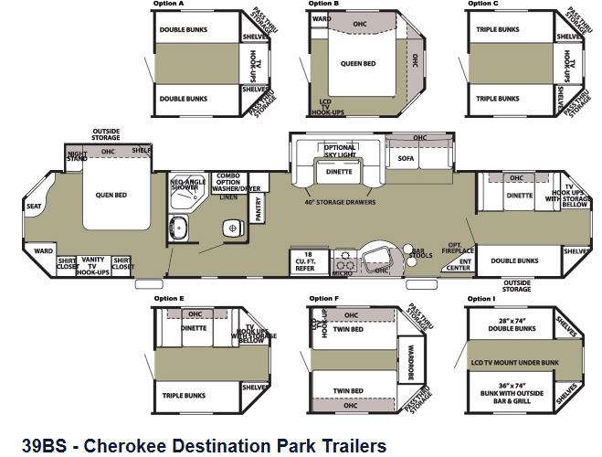 Cherokee Destination Trailer w/Rear Queen Bed Slide, Nightstand, Seat, Ward., Shirt Closet/Vanity w/TV Hook-ups/Shirt Closet, Side Aisle Bath w/Angle Shower, Toilet & Sink, Linen Cabinet, Pantry, Slideout U-Dinette & Sofa, Refrig., 3 Burner Range, Kitchen Sink, Bar Stools, Ent. Center, Front Bunkhouse w/Dinette, TV Hook-ups w/Storage Below, Bunk Beds, Shelves, Outside Storage and More! Avail. Options May Include: Front Bunkhouse Options, Washer/Dryer, Fireplace.