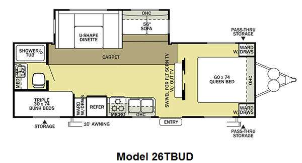 What I liked most: Both front and back exterior storage. Triple bunks inside.. Kitchen drawers with ready-made dividers.