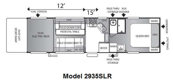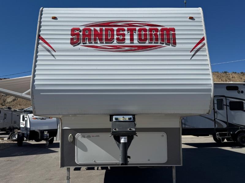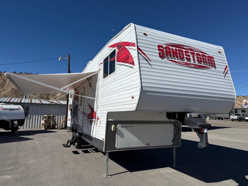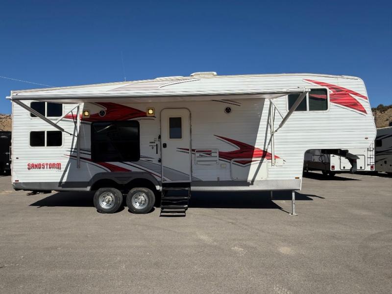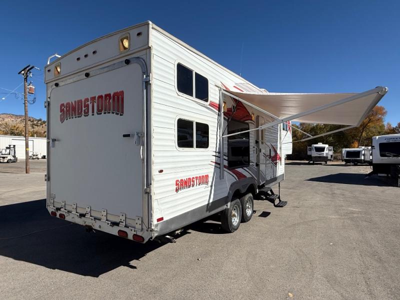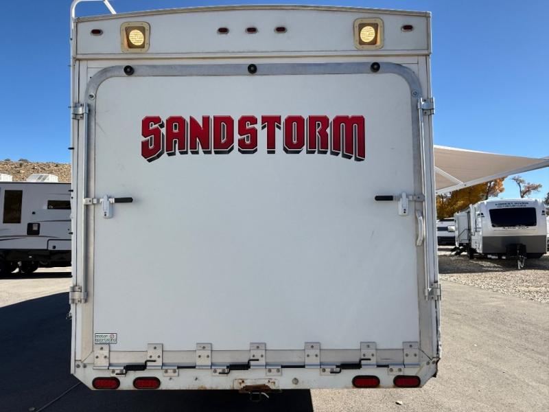 Sandstorm SLR Toyhauler Fifth Wheel, Rear Easy Lift Sport Ramp, Dual Electric Beds, Ext. Fuel Station, Fold Down Sofa w/Pedestal Table, Fold Down Dinette, LCD TV w/DVD, 3-Burner Range, Double Kitchen Sink, Refrigerator, Step Up To Bath/Bed, Toilet, Tub, Ward., Lav., Med. Cab. Front Queen Bed, Double Ward., Overhead Cabinets Throughout, Aux. Shower, Pass Thru Storage & Much More.