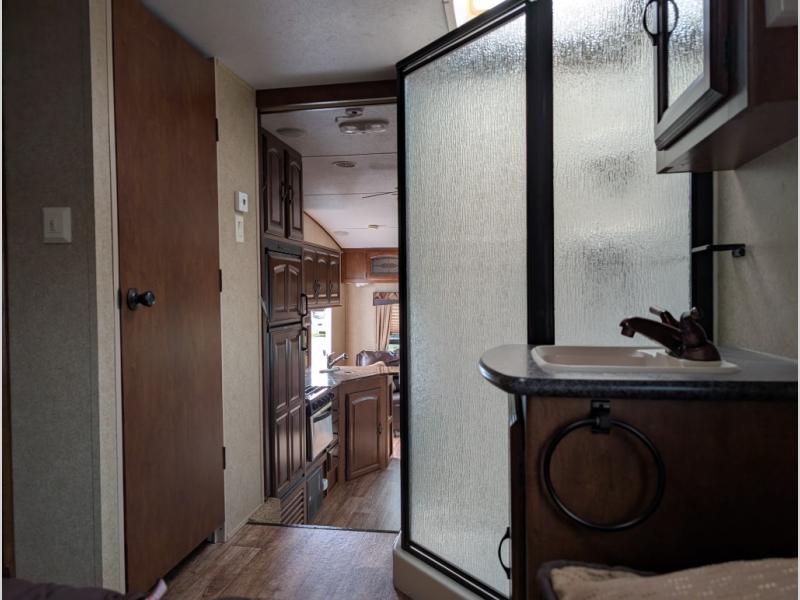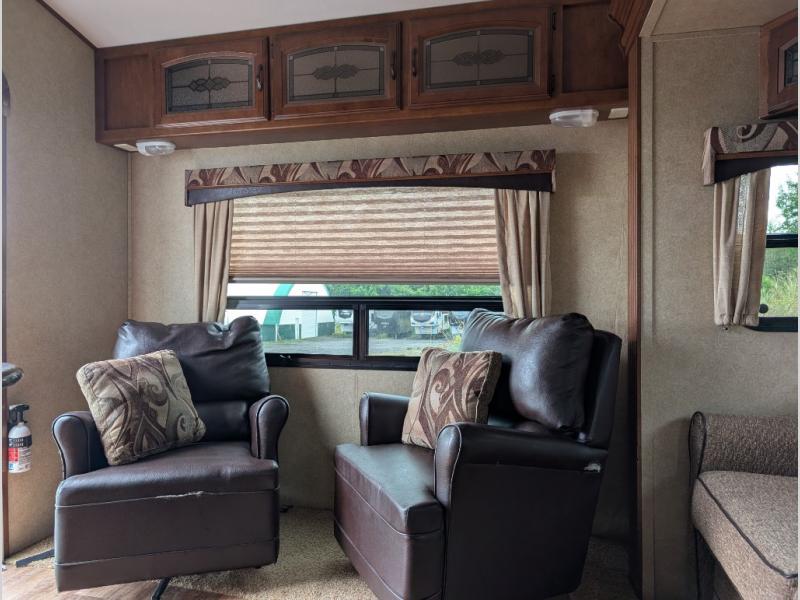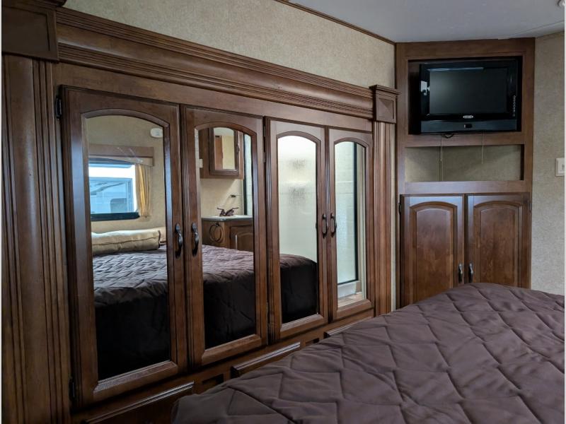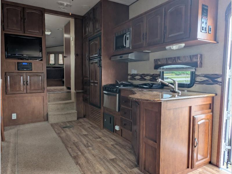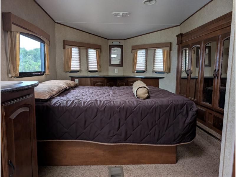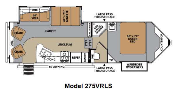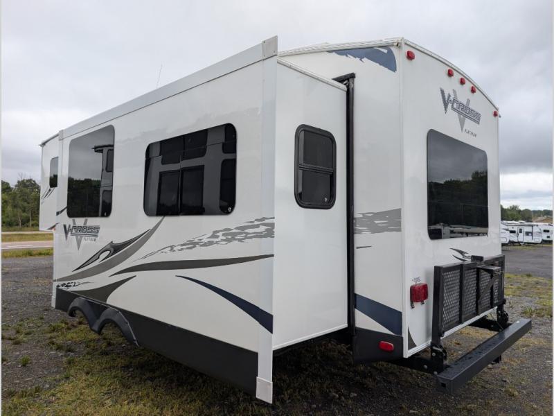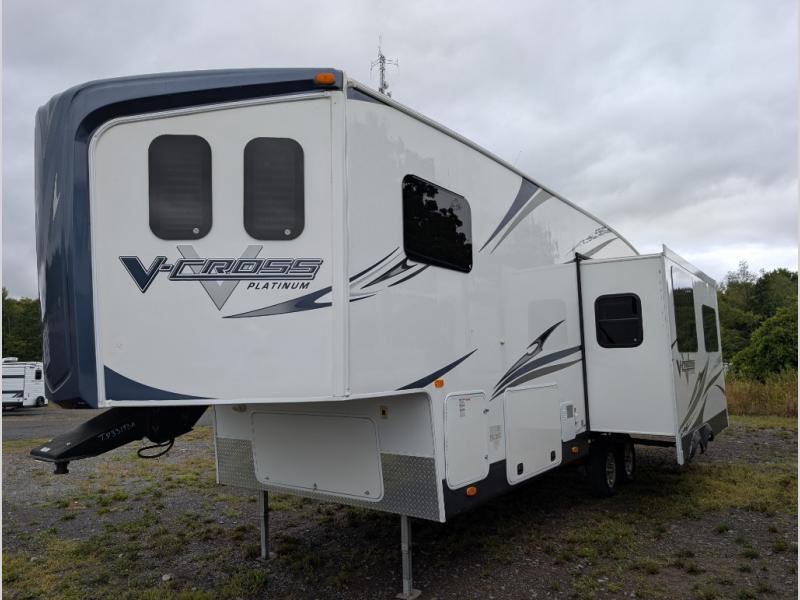 Double Slide V-Cross Platinum Fifth Wheel, Rear Living Area w/2-Lounge Chairs, Sofa/Dinette Slide, Entertainment Center, Dbl. Kitchen Sink, 3-Burner Range, Microwave, Refrigerator, Pantry, Step Up To Bed/Bath, Neo-Angled Shower, Lav., Med. Cab., Queen Bed, Countertop, Wardrobe w/Drawers Slide, TV, Private Toilet Area, Overhead Cabinets Throughout, Large Pass Thru Storage, 15' Awning & Much More.