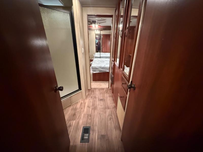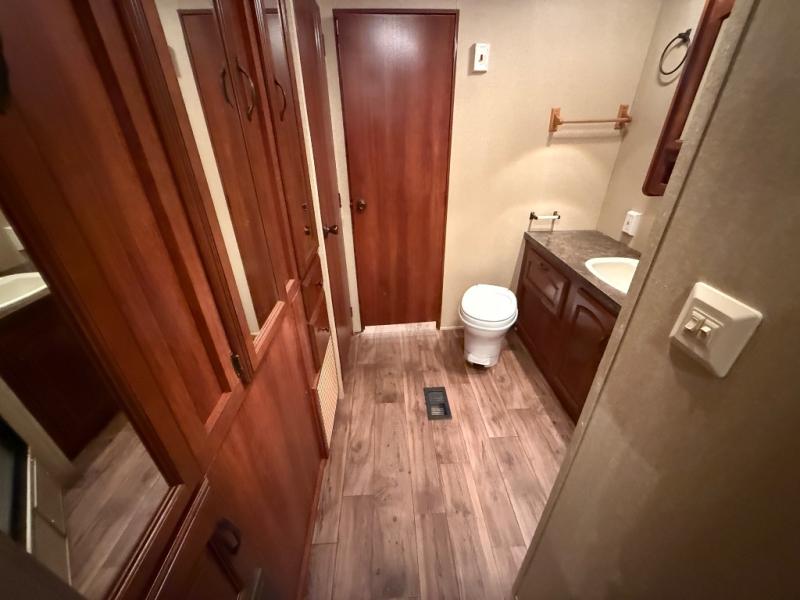 Wildwood Lodge Destination Trailer w/Rear Queen Bed Slide, Ward., Shelves, Vanity, Shirt Closet, Private Bedroom Entry, Walk-Thru Bath w/Ward., Garden Shower, Toilet & Vanity w/Sink, Pantry, House Refrig., Range, Dbl. Kitchen Sink, Dinette w/Chairs/Lounge Chairs & Sofa Slide, Hutch, TV Cab. w/Fireplace, Ceiling Fans, Patio Door & Counter Space, and More! Avail. Options May Include: Bar Stools, Garden Tub.