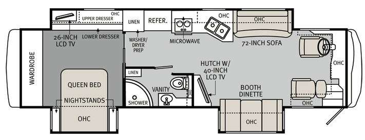 Holiday Rambler Endeavor Class A Diesel Coach w/Rear Slideout Queen Bed w/Nightstands, Wardrobe, 26" LCD TV/Dresser w/Overhead/Washer/Dryer Prep/Linen/Refrig./Range w/Micro. Above/Dbl. Kitchen Sink & 72" Sofa Full Wall Slide, Overhead Storage Above Cab Area, Booth Dinette Slideout, 40" LCD TV w/Hutch, Bath Including: Corner Shower, Linen Cabinet, Vanity w/Sink & Toilet and Much More! Available Options May Include: King Bed, Hide-A-Bed, Workstation/Dinette, U-Dinette, Booth Dinette/Ensemble.