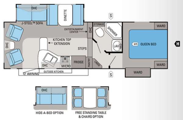 Double Slide Eagle Super Lite HT Fifth Wheel, Rear Living Area w/2-Lounge Chairs, End Table, J-Steel Sofa/Dinette Slide, Ent. Center, Counter Extension, Double Kitchen Sink, 3-Burner Range, Microwave, Refrigerator, Pantry, Step Up To Bed/Bath, Linen, Toilet, Storage, Shower, Lav., Med. Cab., Ward. Slide, Dbl. Ward., Queen Bed, Overhead Cabinets Throughout, 12' Awning, Outside Kitchen & Much More. Available Options May Include: Hide-A-Bed, Free Standing Table & Chairs.