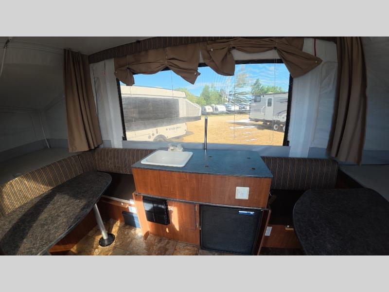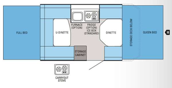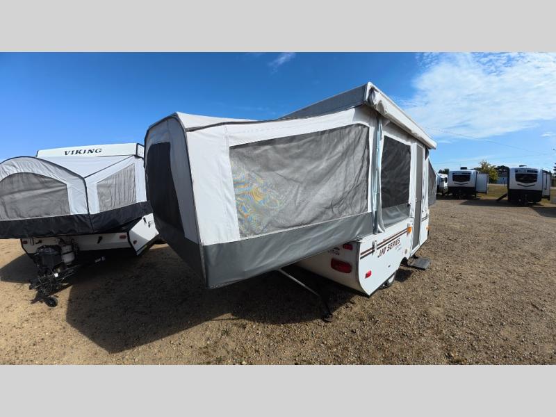 Jay Series Sport Folding Pop-Up Camper, Rear Full Bed, U-Dinette, Storage Cabinet, Front Dinette, Queen Bed w/Storage Deck Below, 2-Burner Range, Ice Box, Single Galley Sink, Carryout Stove & Much More. Available Options May Include: Furnace, Refrigerator.