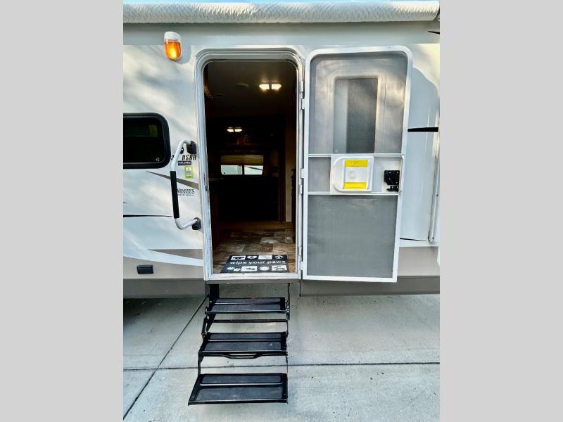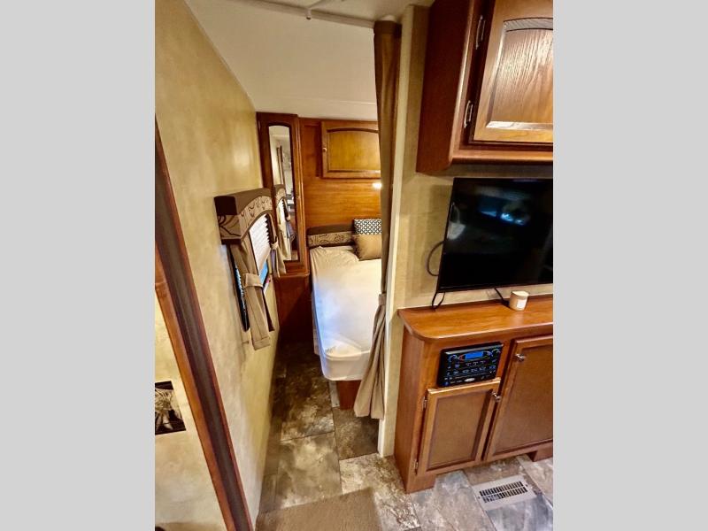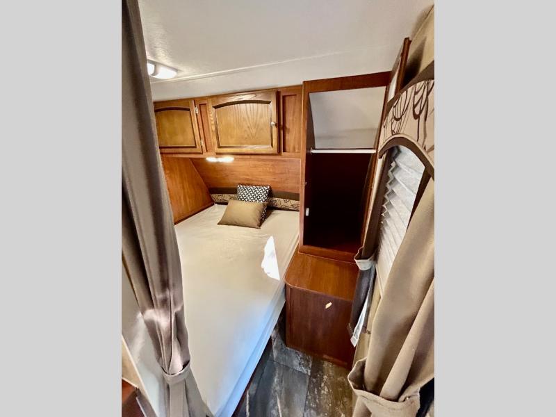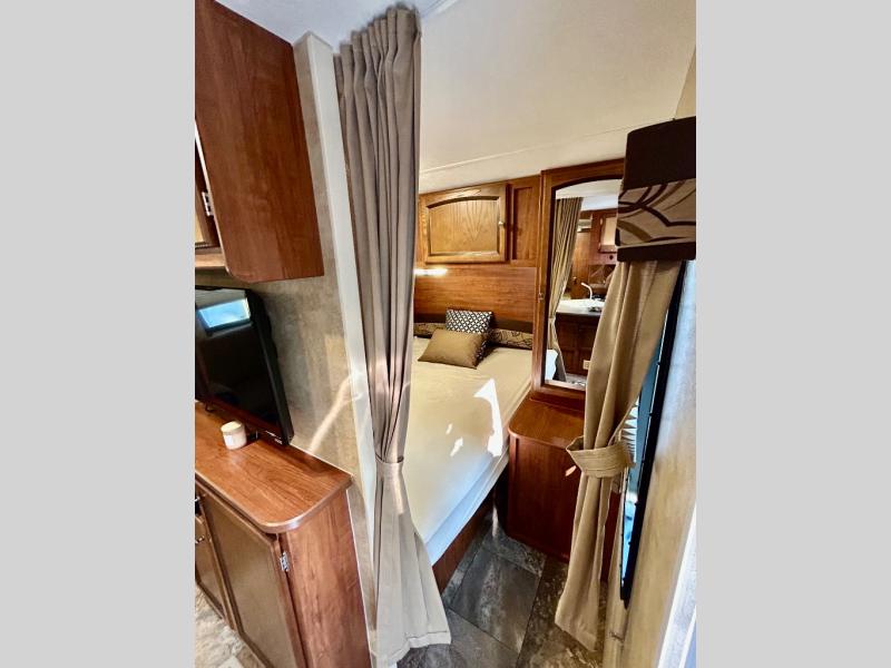 What I liked most: Master bedroom has two sliding pocket doors for privacy, large wardrobes on both sides, and storage up above, and a little extra cubbie hole area on each side of the bed as a nightstand different than I've seen in any other RV. Roomy double bunk beds each having their own electrical outlet, window, shelf, and light. Skylight above the kitchen is a very nice touch for extra light.