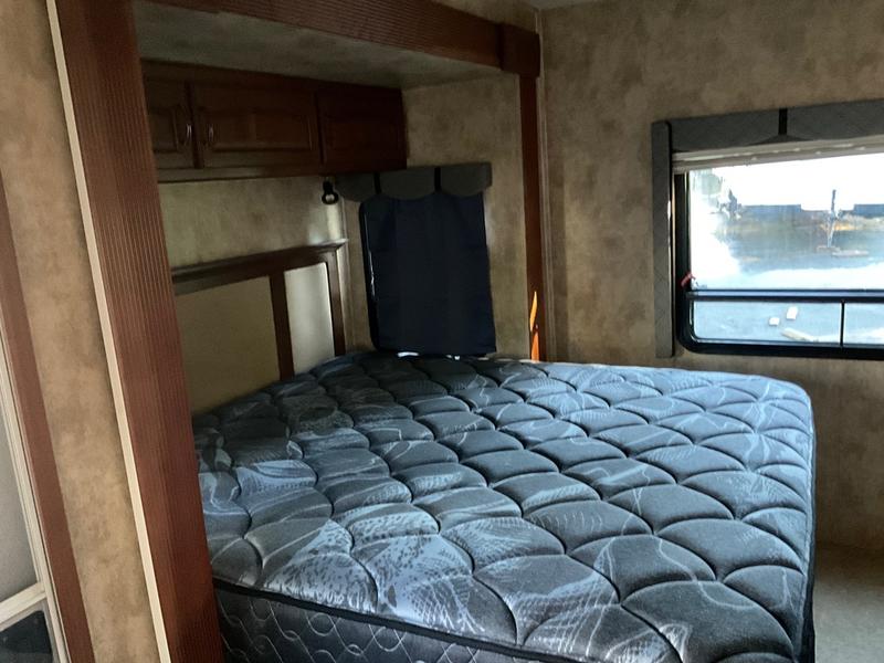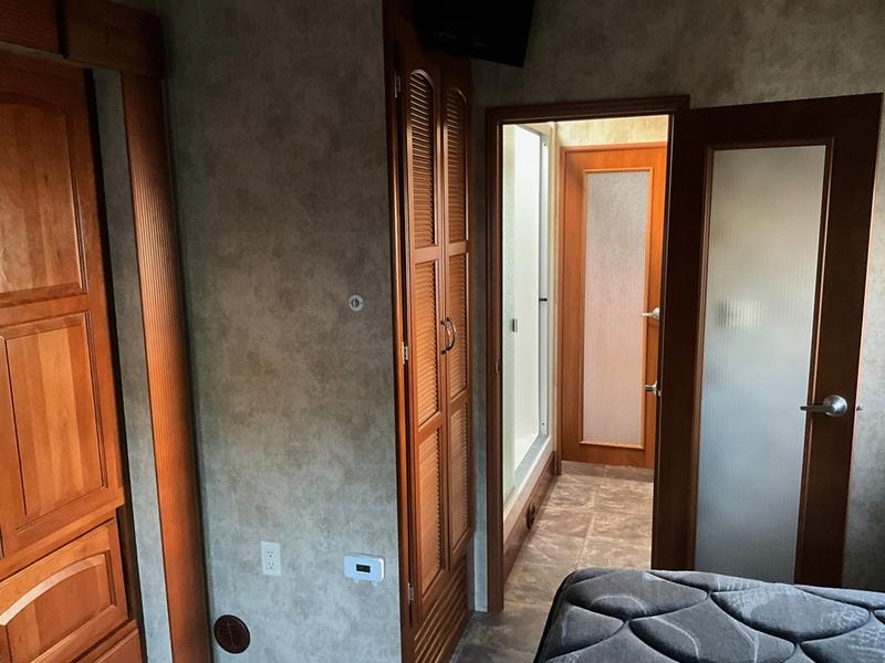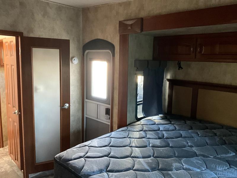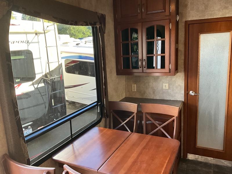 Keystone Alpine Fifth Wheel w/Rear King Bed Slide, Wardrobe/Ent. Center Slide, Washer/Dryer, Private Bedroom Entry, Walk-Thru Bath w/Private Toilet Area, Large Shower, Storage Cabinet, Free Standing Dinette w/Chairs, Slideout Refrig./3 Burner Range/Dbl. Kitchen Sink, Step Up to Front Living Room w/Counter/Curio, Stadium Seating Slideout, Hide-A-Bed Sofa Sleeper Slideout, Front Full Wall Ent. Center w/Cabinets Both Ends and Overhead Storage and Much More!