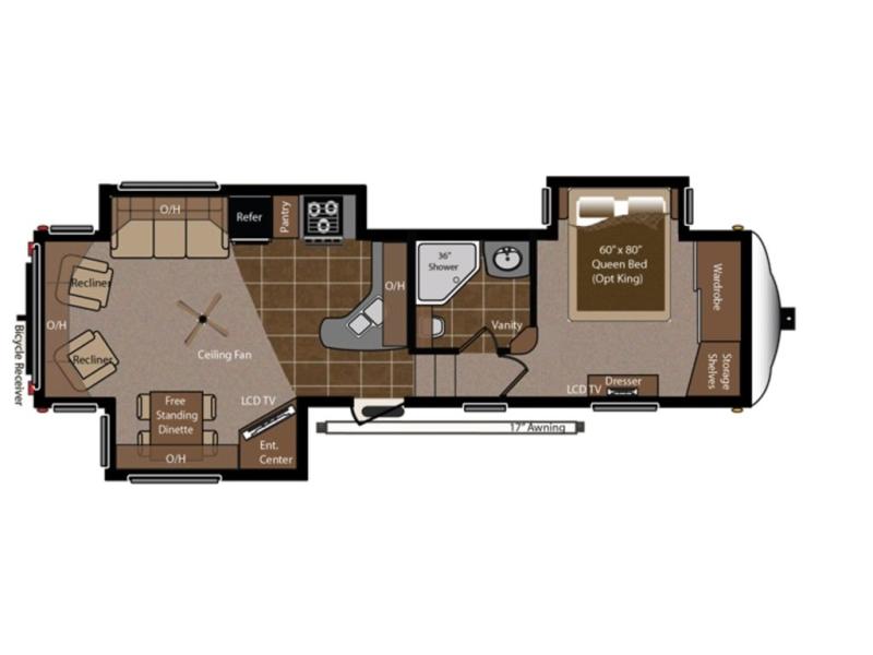Keystone Montana FW w/Rear Living Area Including 2 Recliners, Overhead Cabinets, Free Standing Dinette & Ent. Center Slide w/LCD TV, Ceiling Fan, Sofa/Refrig./Pantry/3 Burner Range Slideout, L-Counter w/Dbl. Kitchen Sink, Overhead Cabinet, Side Aisle Bath w/Angle Shower, Toilet & Sink, Dresser, LCD TV, Front Queen Bed Slide, Wardrobe, Storage Shelves and Much More!