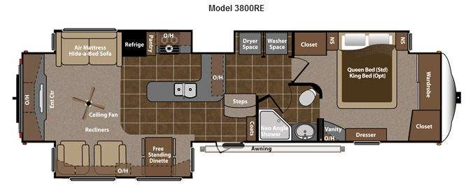 Keystone Montana FW w/Rear Ent. Center w/Overhead Storage, Air Mattress H-A-Bed/Refrig./Pantry/3 Burner Range Slide, Recliners & Free Standing Dining Table & Chairs Slide, L-Counter w/Sink, Coat Closet, Step Up to Bed & Bath w/Neo-Angle Shower, Toilet & Sink, Vanity, Dresser, Closet, Wardrobe w/Sliding Doors, Wash/Dryer Space/Closet/Nightstands & Queen Bed Slide, and More! Avail. Options May Include: King Bed, Big Sky Eligible.