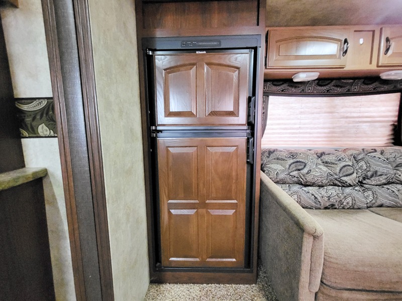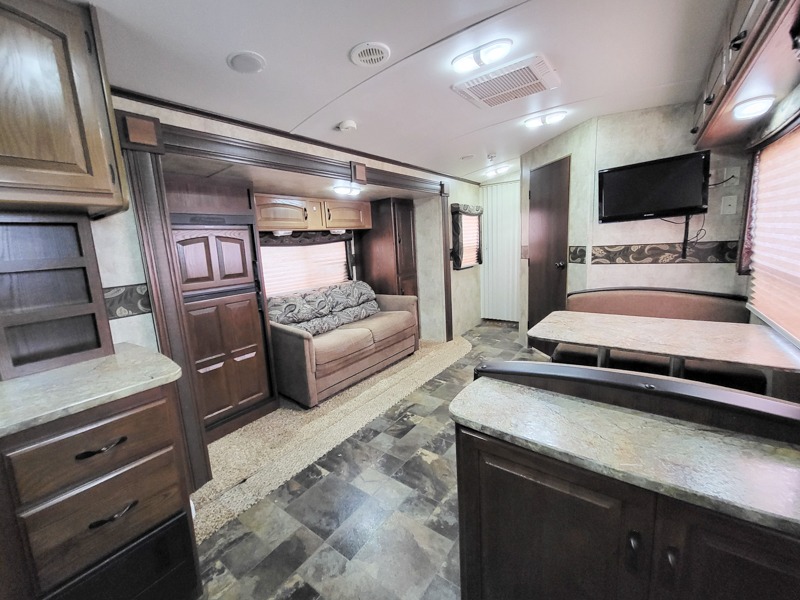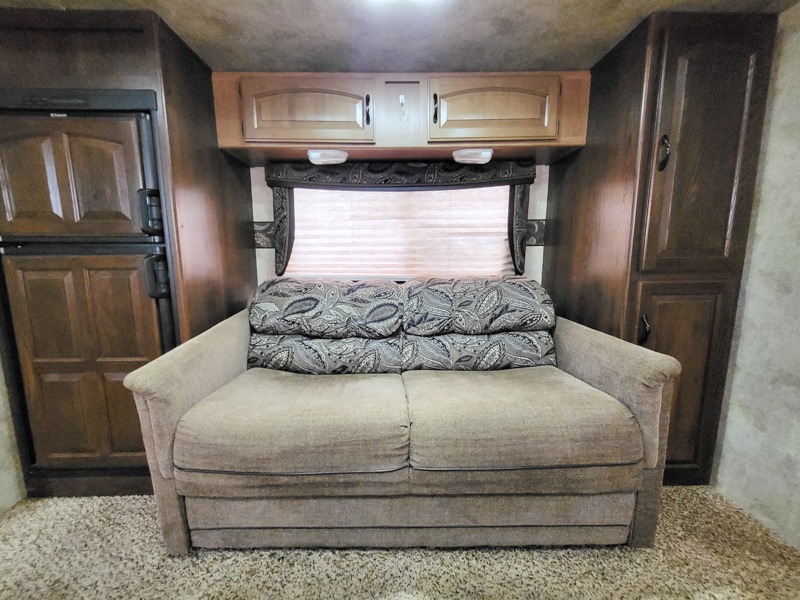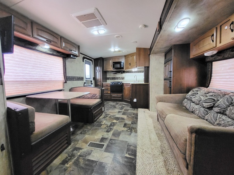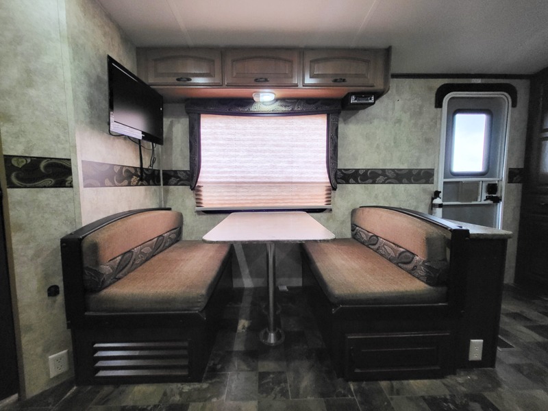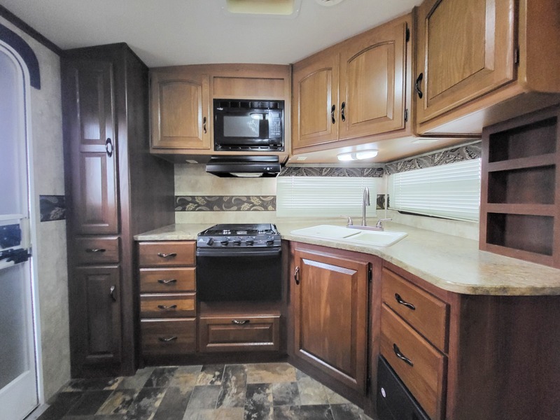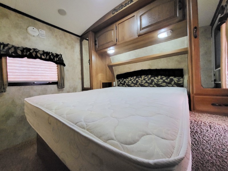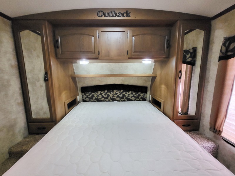 Keystone Outback Travel Trailer w/Rear Kitchen Including: Pantry, 3 Burner Range, Dbl. Kitchen Sink, Overhead Storage, Refrig./Air Sofa Sleeper/Linen Cabinet Slideout, Booth Dinette w/Overhead Cabinet, Side Aisle Bath w/Angle Shower, Toilet & Sink, Front Queen Bed w/Wardrobes Both Sides, Private Bedroom Entry, Front Pass-Thru Storage, Overhead Storage and More!