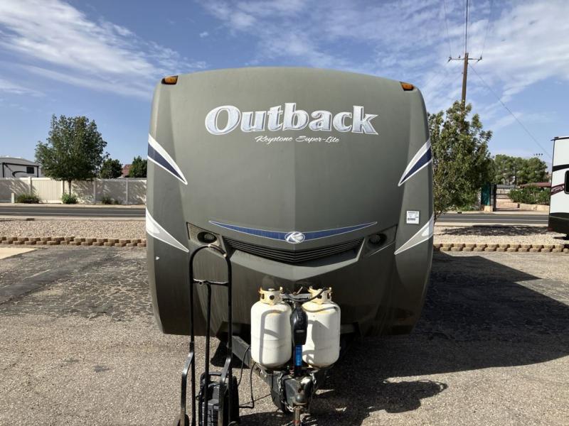 Keystone Outback Travel Trailer w/Rear Full Bath w/Private Entry, Angle Shower, Linen Cabinet & Sink, Private Toilet Area w/Private Entry, Ent. Center, Pantry/Dinette Slideout w/Overhead, Refrig., 3 Burner Range, Dbl. Kitchen Sink, End Table, Air Sofa Sleeper, Front Queen Bed w/Wardrobes Both Side, Front Pass-Thru Storage, Outside Camp Kitchen and Much More!