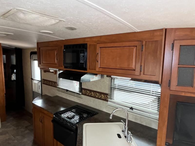 Keystone Premier Ultra Lite Travel Trailer by Bullet w/Rear Living Area Including: 2 Lounge Chairs, End Table & Overhead Cabinet Storage, Air Bed Sofa & Booth Dinette Slideout, LCD TV, Kitchen Sink, 3 Burner Range, Refrigerator, Side Aisle Bath w/Angle Shower, Toilet & Sink, Pantry, Front Queen Bed w/Wardrobes Both Sides, Laundry Chute, Front Pass-Thru Storage, Front & Rear Entry, and So Much More!