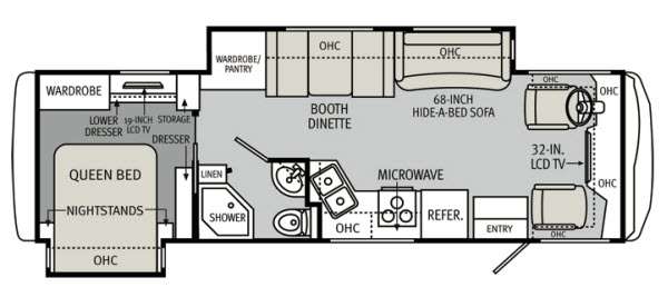 Double Slide Motor Home, Rear Queen Bed/Nightstands Slide, Wardrobe, Dresser, 19" LCD TV, Storage, Wardrobe/Pantry/Booth Dinette/Hide-a-Bed Sofa Slide, Mid-Ship 32" LCD TV, Refrigerator, Microwave, 3-Burner Range, Dbl. Kitchen Sink, Lav., Toilet, Shower, Linen, Dresser, Overhead Cabinets Throughout & Much More.
