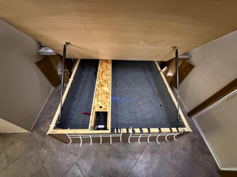 The garage includes an electric lift with two bunks. The lower bunk converts into sofa seating, and both bunks can lower for sleeping or rise for cargo clearance.