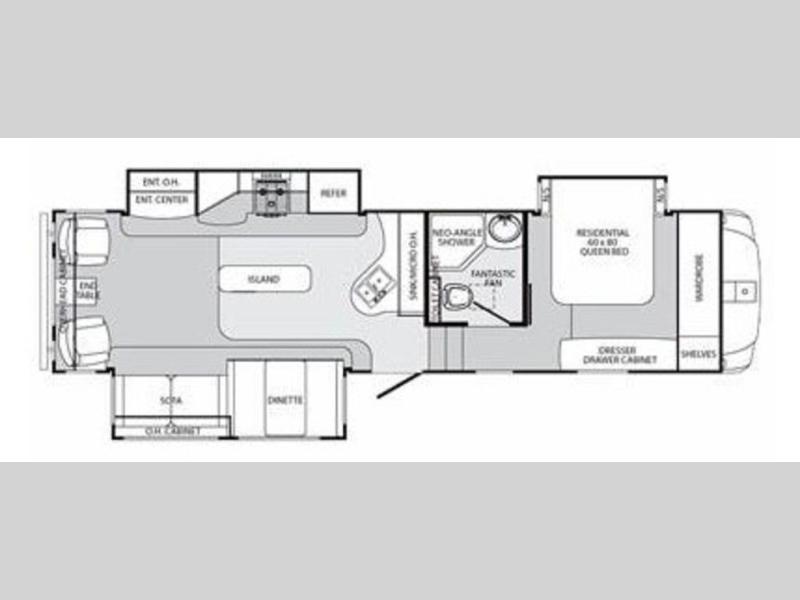 Sabre Fifth Wheel by Palomino w/Rear Living Area Including 2 Swivel Rockers, Overhead Cabinets, Slideout Ent. Center w/Overhead/3 Burner Range w/Micro & Refrigerator, Slideout Sofa w/Overhead & Booth Dinette, Kitchen Island, Dbl. Kitchen Sink w/Overhead Storage, Step Up to Side Aisle Bath w/Toilet, Sink, Neo-Angle Shower & Sink, Queen Bed Slide w/Nightstands & Overhead Cabinets, Wardrobe, Shelves, Dresser w/Drawers & Cabinets and Much More!