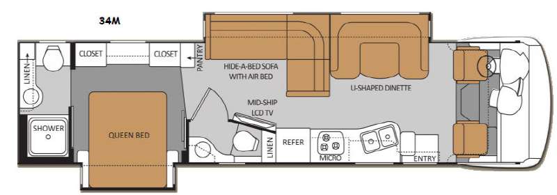 Serrano Class A Diesel by Thor Motor Coach w/Rear Full Bath Including: Shower, Linen Cabinet, Toilet & Sink, Queen Bed Slideout, Closet/Dresser/Closet, Pantry, Hide-A-Bed Sofa w/Air Bed & U-Shaped Dinette Slideout, Mid Ship 32" LCD TV, 1/2 Bath w/Toilet, Sink & Linen Cabinet, Refrigerator, 3 Burner Range w/Microwave, Dbl. Kitchen Sink, Overhead Cabinets & Much More! Available Options May Include: 19" LCD TV in Bedroom.