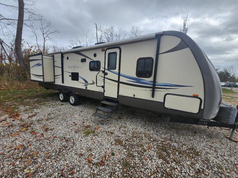 Triple Slide Sunset Trail Reserve Travel Trailer, Dbl. Rear Sofa/Flip-Up Bunk Slides, Entertainment Center, Ward., Pantry, Super Booth Dinette/Sofa Slide, TV, Front Queen Bed, Front Ward., Dbl. Kitchen Sink, 3-Burner Range, Microwave, Refrigerator, Tub, Lav., Med. Cab., Toilet, Overhead Cabinets Throughout, Pass Thru Storage & Much More.