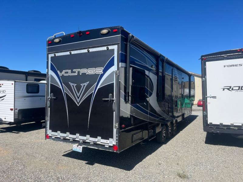 Voltage FW Toy Hauler w/Rear Spring Assist Ramp Door to Cargo w/Side Entry Door, 1/2 Bath w/Kitchen Entry, Queen Bed Loft, Lounge Chair, Wash/Dryer Prep, Door to Living Area, Pantry, Kitchen Island w/Dbl. Sink & Bar Stools, L-Dinette Sofa/Lounge w/Stowable Table Slide, Slideout Pantry/Refrigerator/3 Burner Range, Ent. Center w/42" TV, Step Up to Bed & Bath w/Separate Entry, Toilet, Sink, Overhead Storage, Shower, Front Queen Bed Hinged Top, Nightstands, Ward./Dresser/Ward. Slide, TV and More!