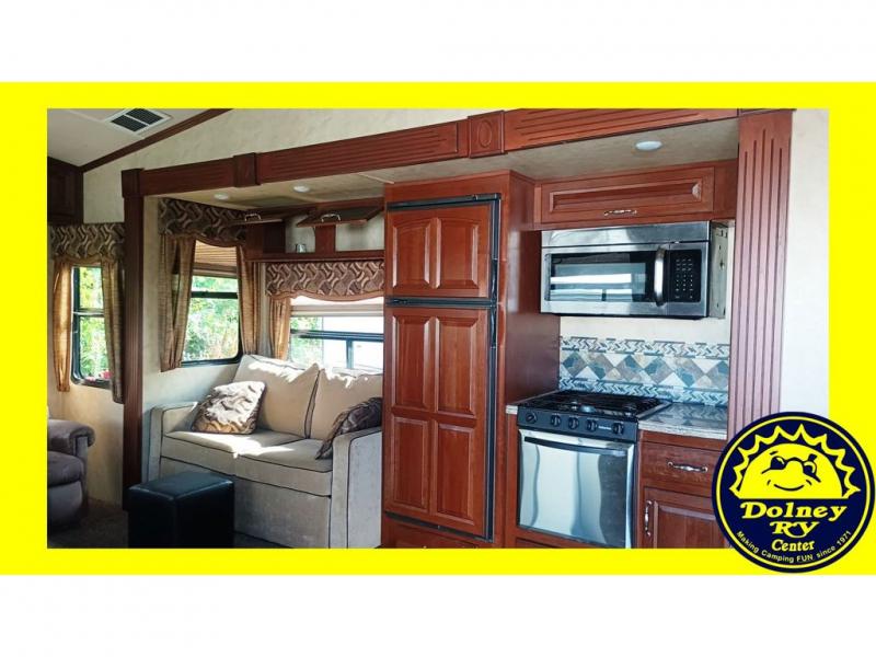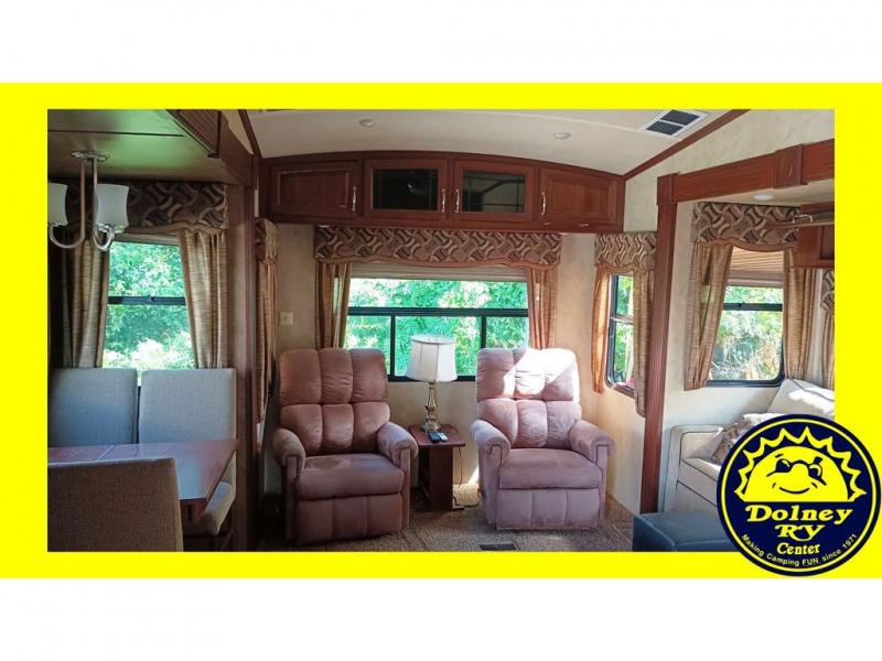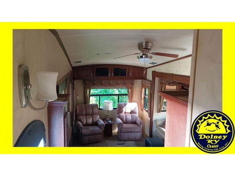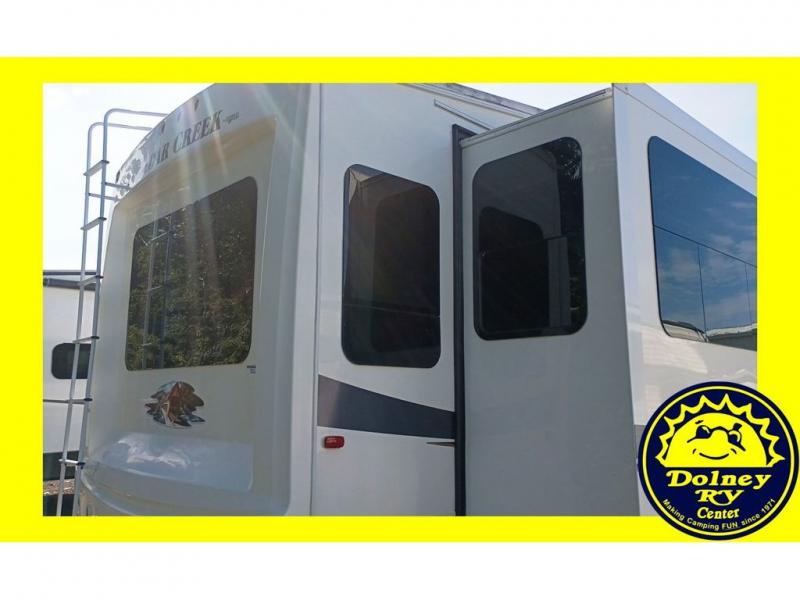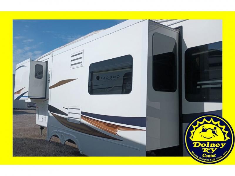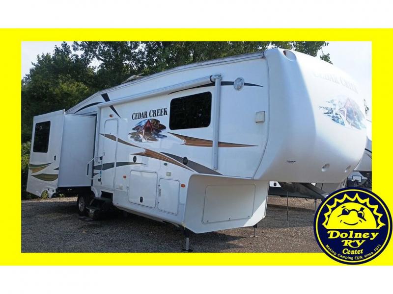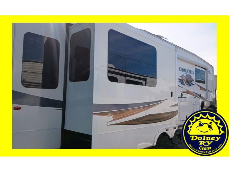 Triple Slide Cedar Creek Fifth Wheel, Rear Living Area w/2-Lounge Chairs, Sofa/Refrigerator/3-Burner Range Slide, Dinette/Fireplace Slide, Double Kitchen Sink, Step Up To Bed/Bath, Toilet, Lav., Shower, Queen Bed Slide, Vanity, TV, Wardrobe w/Drawers & Shelves, Overhead Cabinets Throughout & Much More.