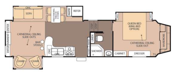 Triple Slide Cedar Creek Silverback Fifth Wheel, Rear Sofa, End Tables, TV/Fireplace/Pantry/Refrigerator/Microwave/3-Burner Range Slide, Dbl. Kitchen Sink, Island, 2-Lounge Chairs/Free-Standing Table Slide, Step Up To Bed/Bath, Toilet, Linen, Shower, Lav., Queen Bed Slide, Wardrobe, TV, Dresser, Overhead Cabinets Throughout & Much More. Available Options May Include: King Bed.