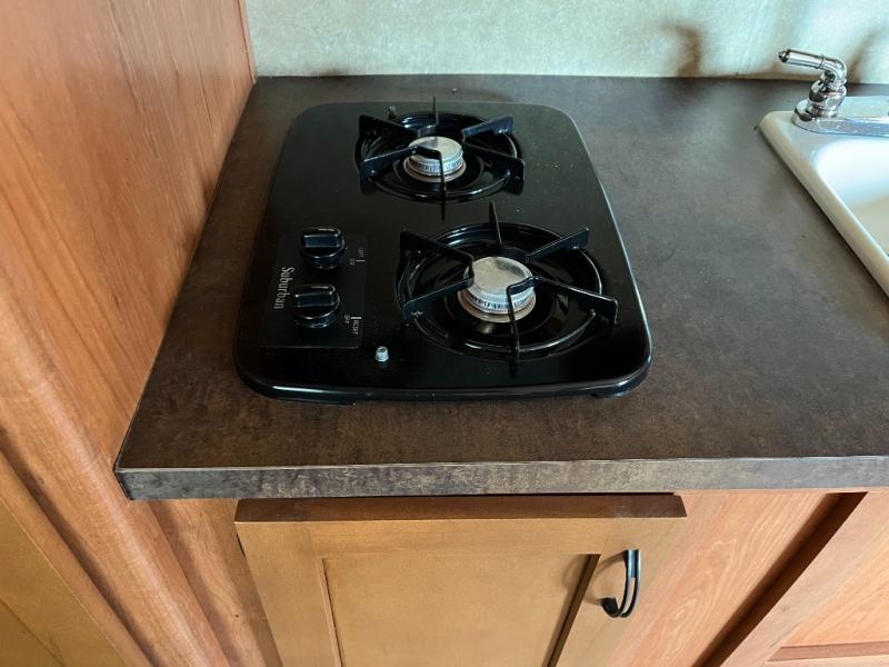 The kitchen is compact yet well equipped, featuring a cooktop, microwave, refrigerator, sink, and cabinet storage for meal prep on the road. It’s perfect for quick breakfasts before a day of hiking or easy dinners back at camp.