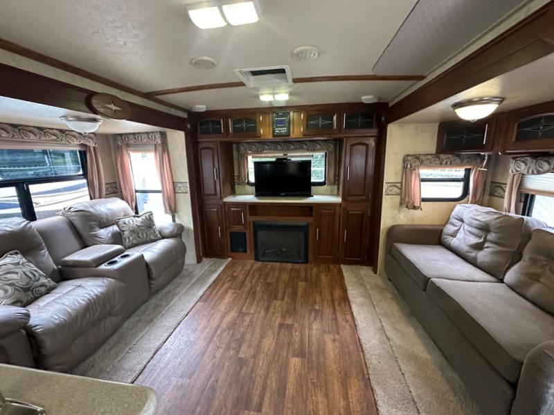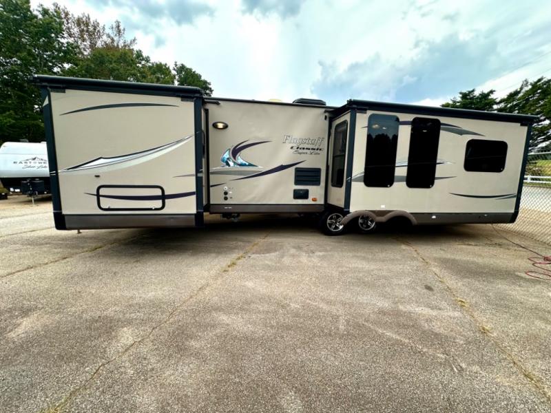 Triple Slide Flagstaff Classic Super Lite Travel Trailer, Rear Entertainment Center, Hide-A-Bed Sofa/Dinette Slide, 2-Chairs Slide, Dbl. Kitchen Sink, 3-Burner Range, Refrigerator, Pantry, Linen, Garden Shower, Lav., Toilet, Bed/Nightstands Slide, End Table, Wardrobe, Shelf, Overhead Cabinets Throughout & Much More. Available Options May Include: Rear Ladder, Recliners, RVQUE Gas Grill, C'Top Extension, Wall Mount TV in Bedroom.
