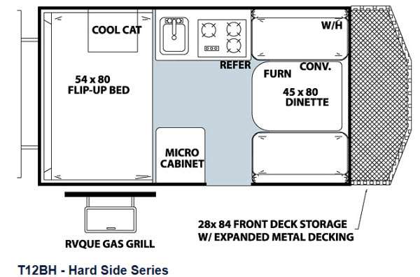 Rear Flip-Up Bed, Cool Cat, Single Galley Sink, 3-Burner Range, Refrigerator, Dinette, Furnace, Microwave, RVQUE Gas Grill, Front Deck Storage w/Expanded Metal Decking & Much More.