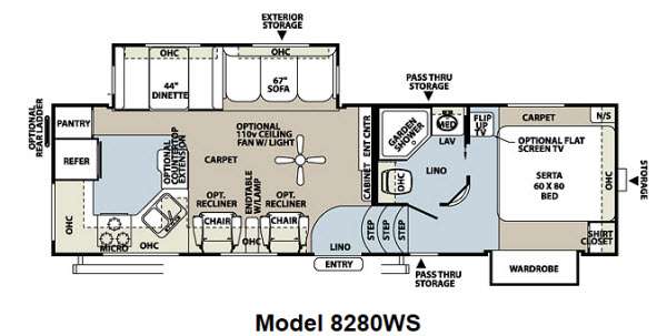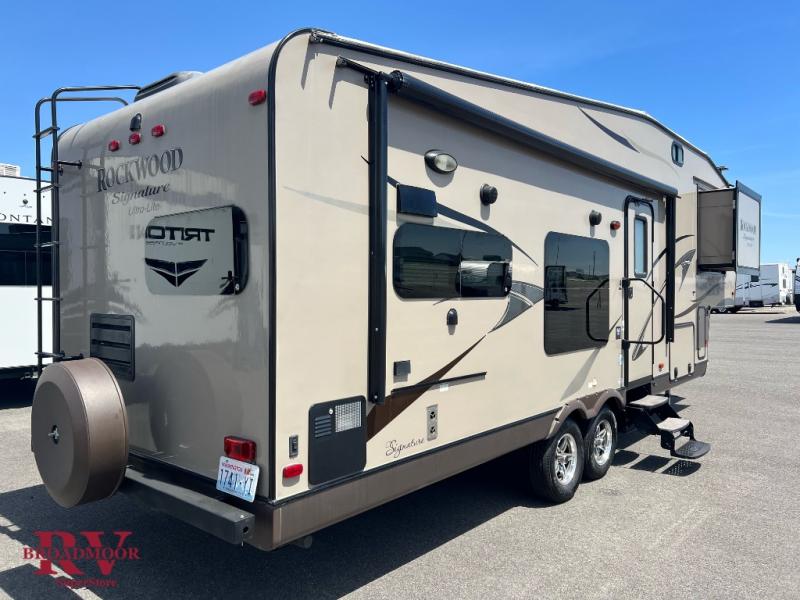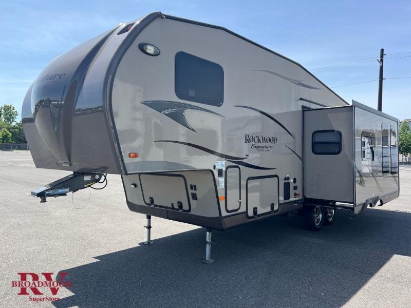 Rockwood Fifth Wheel Signature Series w/Double Slide Outs and Rear Kitchen Including Pantry, Refrigerator, 3 Burner Range, Dbl. Kitchen Sink, Overhead Cabinets, Microwave, 2 Barrel Chairs, End Table w/Lamp, Ent. Center, Booth Dinette/Sofa Slide, Queen Bed w/Overhead Storage, Nightstand & Shirt Closet, Flip Up TV, Garden Shower, Lav. w/Med. Cabinet & Toilet, Awning, Pass-Thru Storage & More! Available Options May Include: Rear Ladder, C'Top Ext., Ceiling Fan, Flat Screen TV in Bedroom