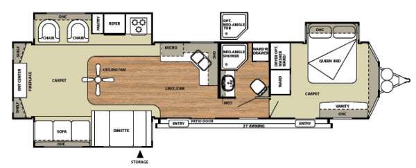 As you enter the destination trailer, to the left there is a slide with a dinette and a sofa. Along the rear wall you will find an entertainment center with fireplace below and shelves on either side. The other slide has two lounge chairs, a pantry, refrigerator, and three burner range. Next to the slide there is a microwave, and double kitchen sink.