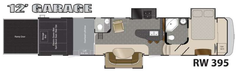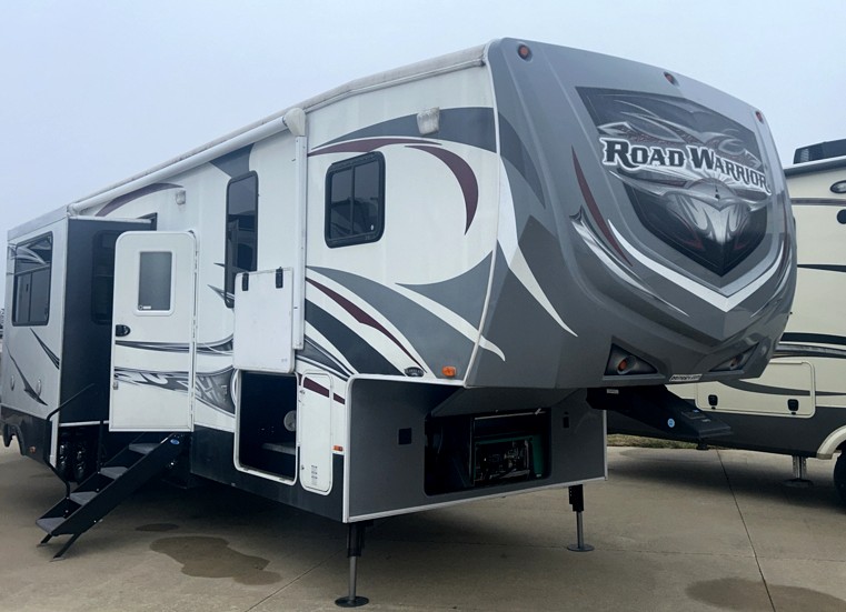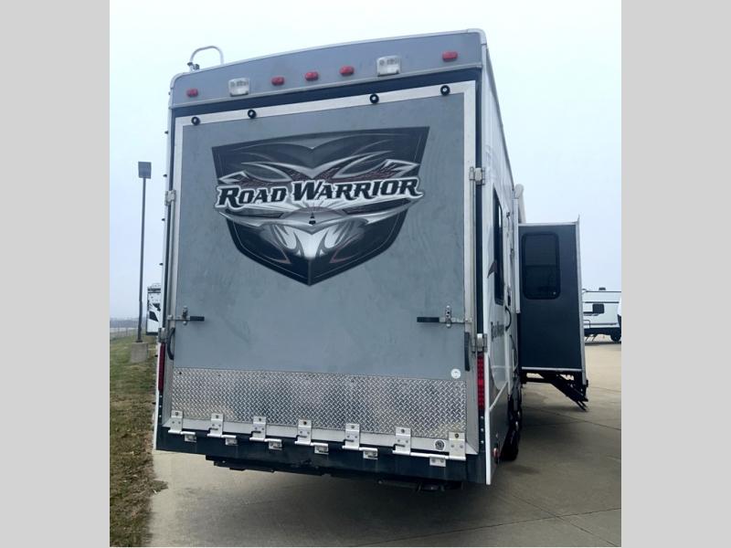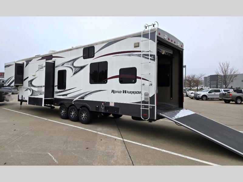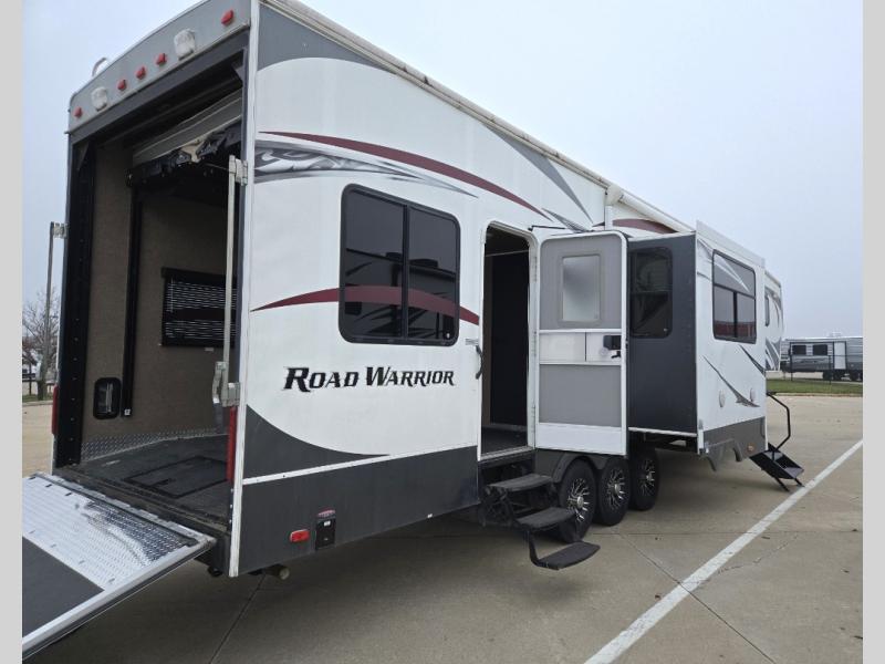 Triple Slide Road Warrior FW Toy Hauler w/Rear 12' Cargo Area w/Storage Box, Overhead Loft w/Ent. Center, Cargo Side Door, Door to Living Area, Loft Ladder, 1/2 Bath, Lounge Chair, U-Shaped Sofa w/Table Slide, Slideout Refrig. & 3 Burner Range, Dbl. Kitchen Sink, Side Aisle Bath w/Dbl. Entry, Shower, Sink & Toilet, Front Queen Bed Slide w/Storage, Dresser, Ward. w/Built in Storage & More! Avail. Options May Include: Washer/Dryer, Electric Queen Bed/Split Bench Seat.