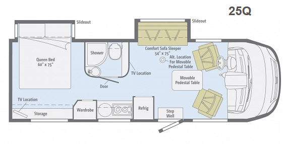 Itasca Reyo Class A Diesel Coach w/Double Slideouts, Rear Queen Bed Slide, 22" LCD TV/Storage, Wardrobe, Bath w/Corner Shower, Toilet & Sink, Round Kitchen Sink, 2 Burner Cooktop, Refrigerator, Comfort Sofa Sleeper Slideout w/Movable Pedestal Table, 26" TV in Living Area and More!