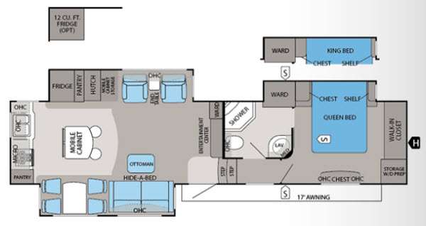 Triple Slide Eagle Premier Fifth Wheel, Rear Kitchen w/Dbl. Kitchen Sink, 3-Burner Range, Microwave, Pantry, Dinette/Hide-a-Bed Slide, Mobile Cabinet, 2-Barstools, Refrigerator/Hutch/Mobile Cabinet Storage/2-Lounge Chairs/End Table Slide, Ward., Entertainment Center, Step Up To Bed/Bath, Toilet, Shower, Lav., Med. Cab., Wardrobe/Queen Bed Slide, Walk-In Closet, Storage, W/D Prep, Chest, Overhead Cabinets Throughout & Much More. Available Options May Include: King Bed, Free-Standing Table/Chairs.