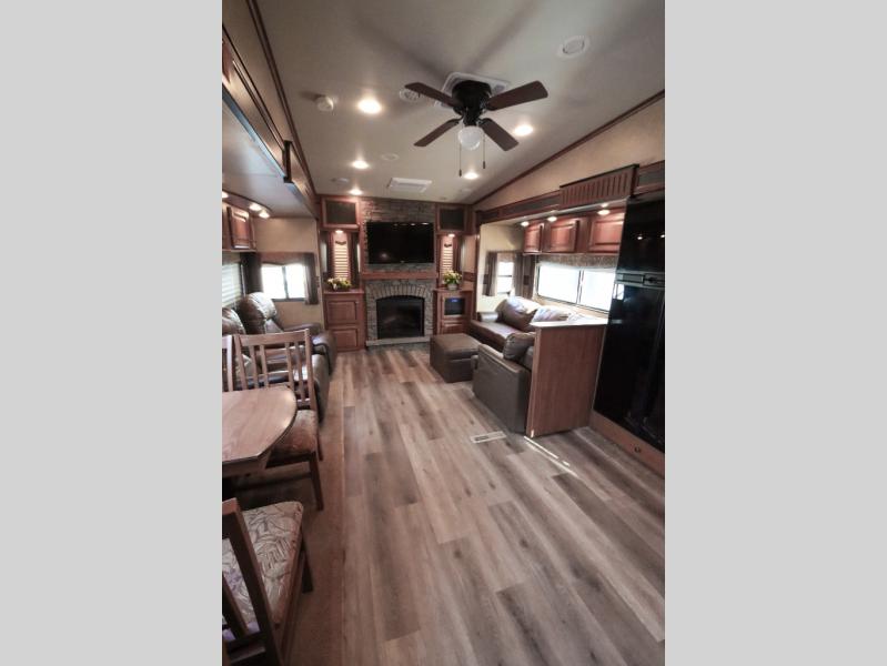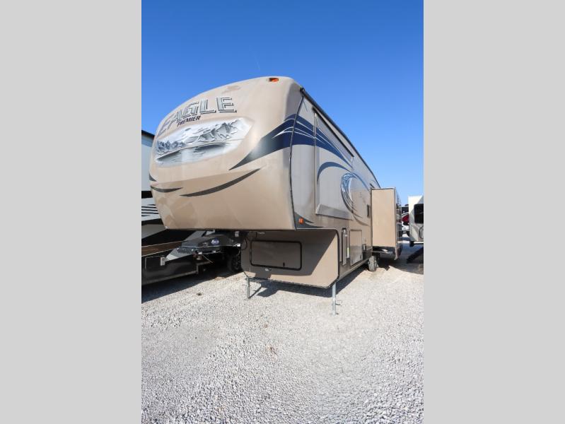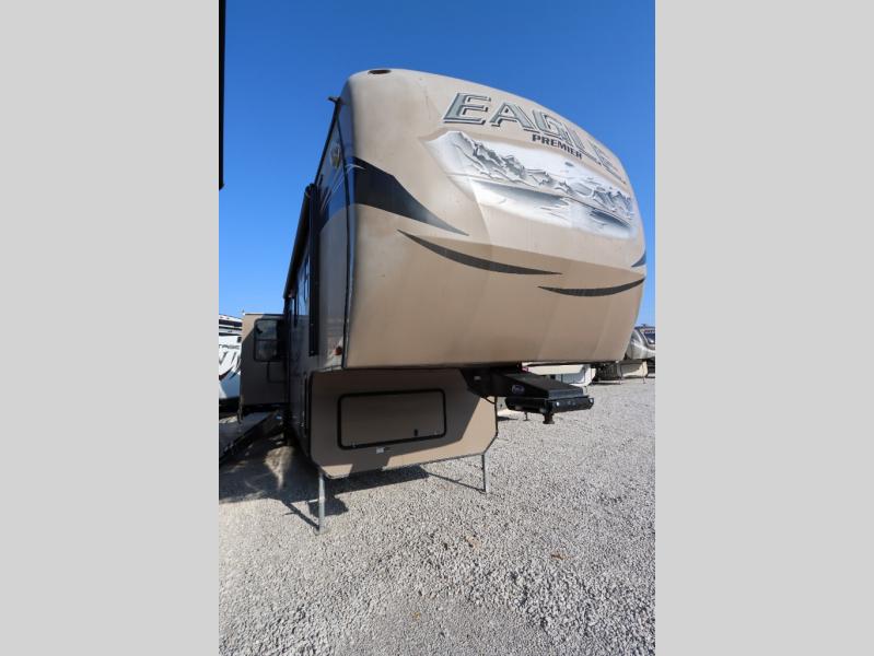 Triple Slide Eagle Premier Fifth Wheel, Rear Entertainment Center, Wrap Around Sofa/Refrigerator/Pantry/Microwave/3-Burner Range Slide, 2-Lounge Chairs/Free-Standing Table & Chairs Slide, Pull-Out Cutting Board, Dbl. Kitchen Sink, Step Up To Bed/Bath, Toilet, Linen, Shower, Lav., Med. Cab. Queen Bed Slide, Walk-In Closet, Storage, W/D Prep, Chest, Overhead Cabinets Throughout & Much More. Available Options May Include: King Bed, 12 cu. ft. Refrigerator, Fireplace.