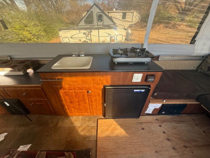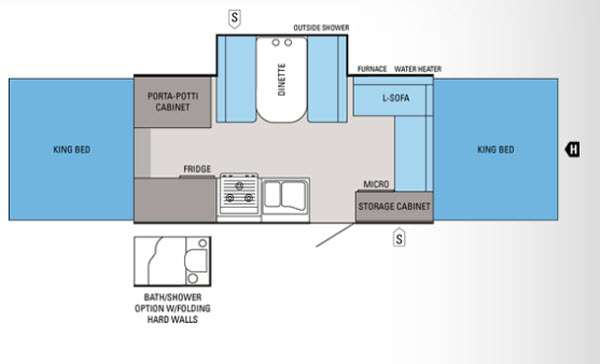 Single Slide Select Pop-Up Camper by Jayco, Rear King Bed Tent End, Refrigerator, 3 Burner Range, Double Kitchen Sink, Microwave, Storage Cabinet, L-Sofa, Water Heater, Furnace, Slideout Booth Dinette, Outside Shower, Front King Bed Tent End and More. Available Options May Include: Bath/Shower w/Folding Hard Walls.