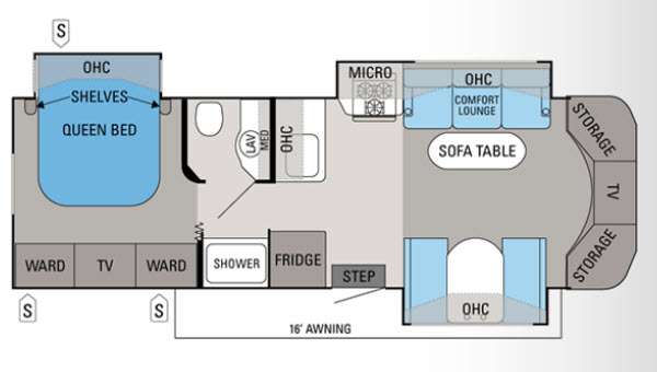 Triple Slide Melbourne Class C Motorhome by Jayco, Rear Queen Bed Slideout w/Overhead Cabinet, Wardrobes, TV, Shower, Private Toilet Area w/Lav. & Med. Cabinet, Refrigerator, Kitchen Sink, 3 Burner Range/Microwave/Comfort Lounger Slideout, Sofa Table, Storage w/TV Above Cab Area, Booth Dinette Slideout, 16' Awning and Much More.