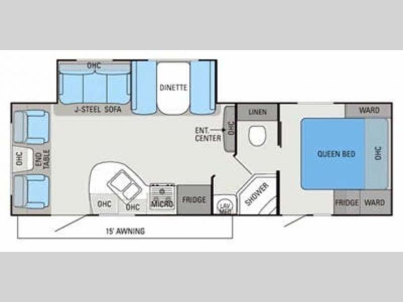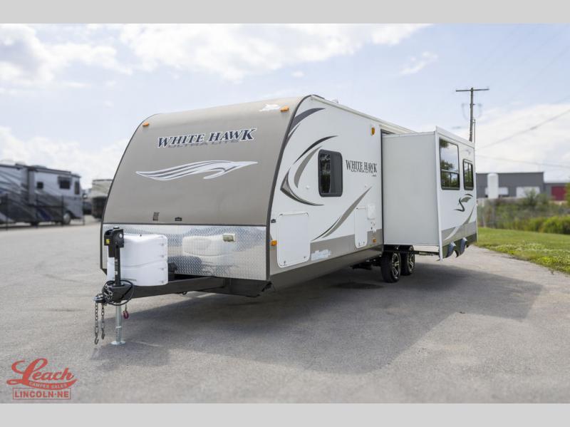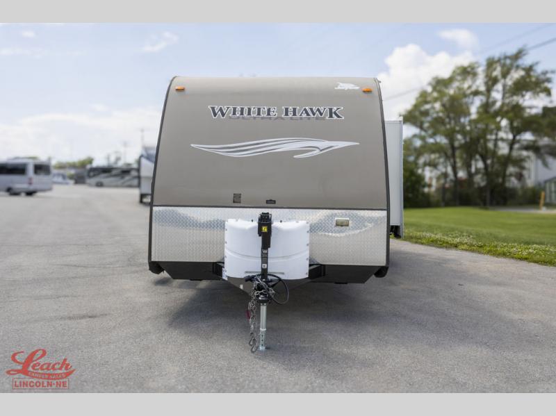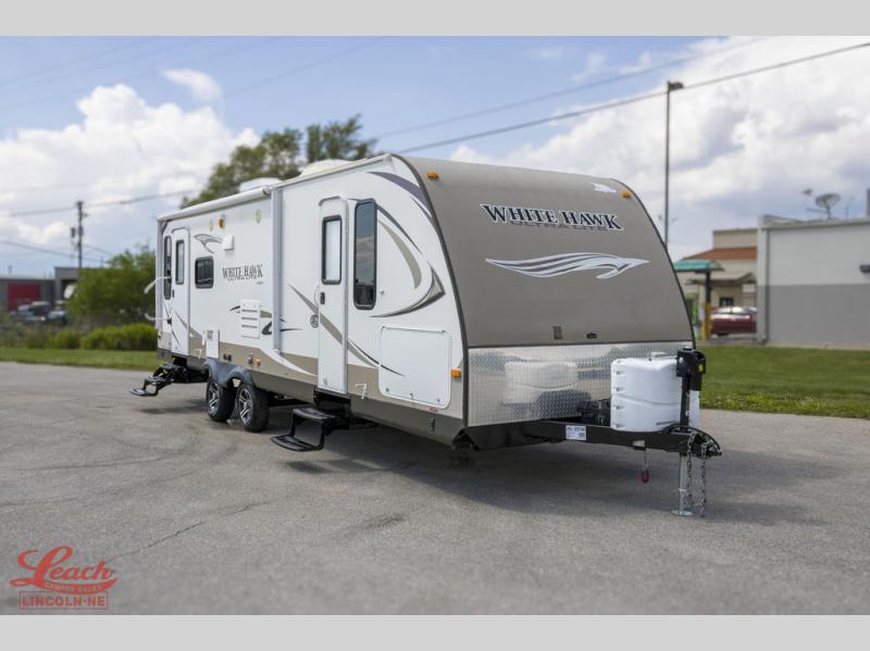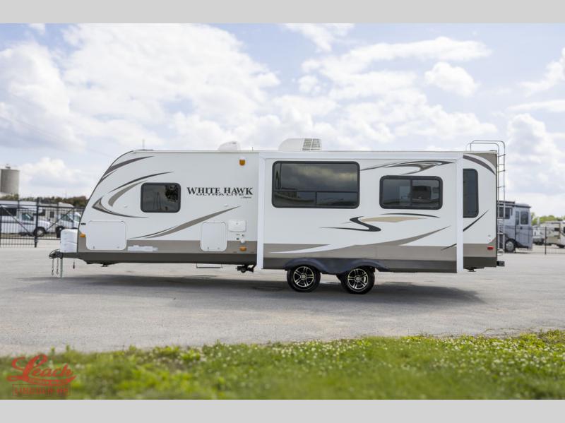 Single Slide White Hawk Travel Trailer, Rear Living Area w/2-Lounge Chairs, End Table, Sofa/Dinette Slide, Entertainment Center, Linen, Toilet, Queen Bed, Dbl. Wardrobes, Shower, Lav., Med. Cab., Refrigerator, 3-Burner Range, Microwave, Dbl. Kitchen Sink, Overhead Cabinets Throughout, 15' Awning & Much More. Available Options May Include: Hide-a-Bed, Free-Standing Table & Chairs.