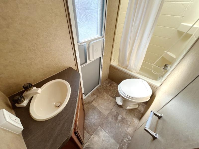 What I liked most: Master bedroom has two sliding pocket doors for privacy, large wardrobes on both sides, and storage up above, and a little extra cubbie hole area on each side of the bed as a nightstand different than I've seen in any other RV. Roomy double bunk beds each having their own electrical outlet, window, shelf, and light. Skylight above the kitchen is a very nice touch for extra light.