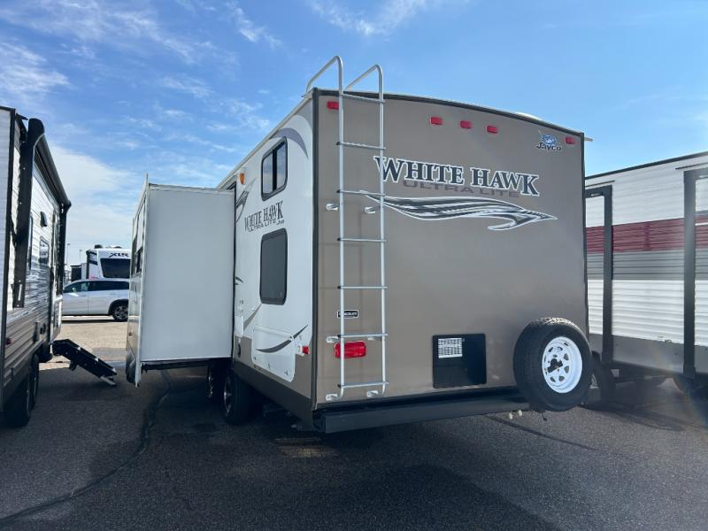 Single Slide White Hawk Travel Trailer, Rear Double Bed Bunk Beds, Tub/Shower, Toilet, Lav., Med Cab., Pantry/Ward., Refrigerator, Microwave, 3-Burner Range, Dbl. Kitchen Sink, Entertainment Center, Queen Bed, Dbl. Wardrobes, Sofa/Dinette Slide, Pantry, Overhead Cabinets Throughout & Much More. Available Options May Include: Free-Standing Table & Chairs, Hide-a-Bed.