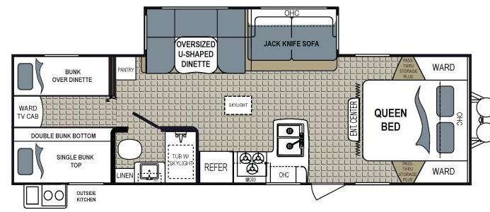 Kodiak Bunkhouse Travel Trailer by Dutchmen w/Rear Dbl. Bed w/Bunk Above, Ward./TV Cabinet, Bunk Over Dinette, Pantry, Oversized U-Shaped Dinette & Jack-Knife Sofa Slideout, Ent. Center, Dbl. Kitchen Sink, 3 Burner Range, Micro., Refrig., Tub/Shower w/Skylight, Sink, Linen Cab., & Toilet, Skylight, Front Queen Bed w/Wardrobe, Overhead Storage, Front Pass-Thru, Outside Kitchen & Much More!