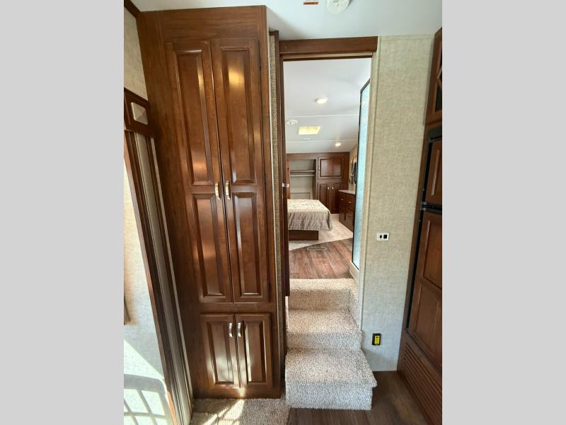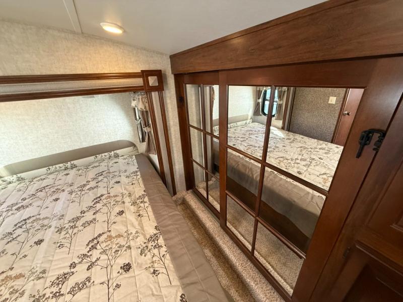 Up front, the private bedroom features a queen bed slide, wardrobe storage, and overhead cabinets to keep your belongings organized. The bathroom includes a sink, toilet, and a garden-style tub/shower, giving you all the comforts of home while traveling.