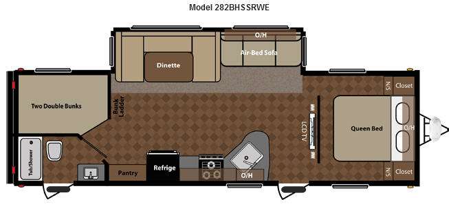 Keystone Bunkhouse Springdale w/Rear Dbl. Bed Bunks, Rear Corner Bath Including: Toilet, Sink & Tub/Shower, Private Bath Entry, Pantry, Refrig., 3 Burner Range, Kitchen Sink, Overhead Storage, Slideout U-Dinette &Air Bed Sofa w/Overhead, LCD TV, Front Queen Bed w/Closets Both Sides of Bed and More!