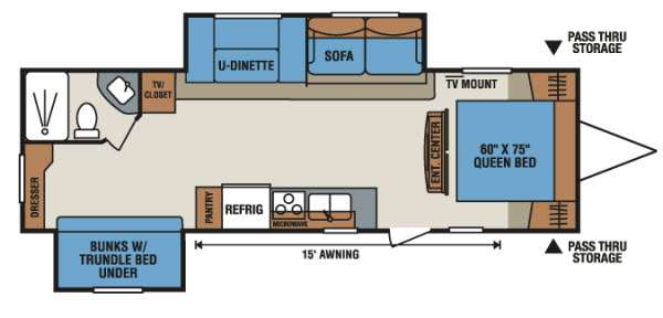 Double Slide Sportsmen TT, Rear Trunk Door, Bunks w/Trundle Bed Under Slide Out, Dresser, Rear Corner Bath w/Tub, Toilet, Lav., TV/Closet, U-Dinette/Sofa Slideout, Pantry, Refrig., 3 Burner Range, Microwave, Dbl. Kitchen Sink, Entertainment Center, Front Queen Bed w/Dbl. Ward., TV Mount, Front Pass Thru Storage, 15' Awning & More.