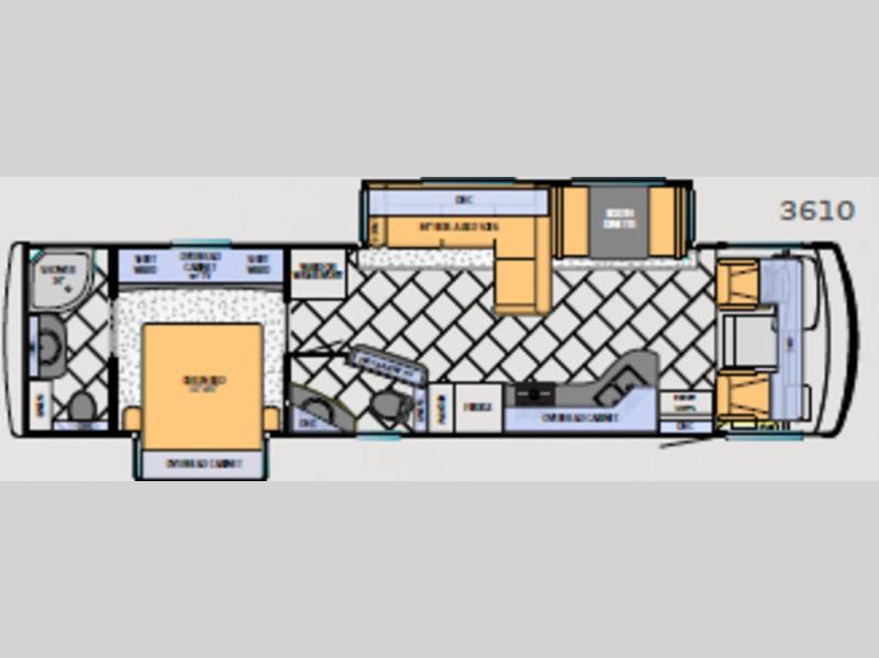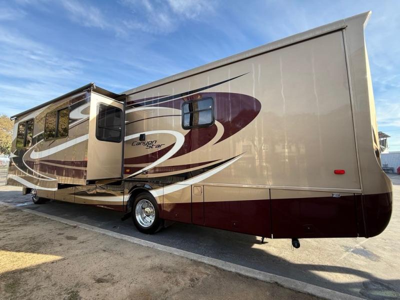 Double Slide Canyon Star Motor Home, Rear Bath w/Toilet, Linen, Lav., Shower, Dbl. Shirt Ward., Cabinet w/TV, Ward., Hide-a-Bed Sofa/Booth Dinette Slide, Dbl. Kitchen Sink, 3-Burner Range, Refrigerator, Pantry, Dry Bar w/TV, Half Bath, Queen Bed Slide, Overhead Cabinets Throughout and Much More. Available Options May Include: Washer/Dryer.
