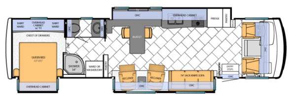 Triple Slide Canyon Star Motor Home, Rear Queen Bed Slide, Shower, Ward., Pantry, 2-Recliners/Jack Knife Sofa Slide, Shelves/Pantry/Refrigerator/3-Burner Range/Dbl. Kitchen Sink/Free-Standing Table/TV Slide, Private Toilet Area w/Lav., Dbl. Shirt Ward., Chest of Drawers w/TV Above, Overhead Cabinets Throughout & Much More.