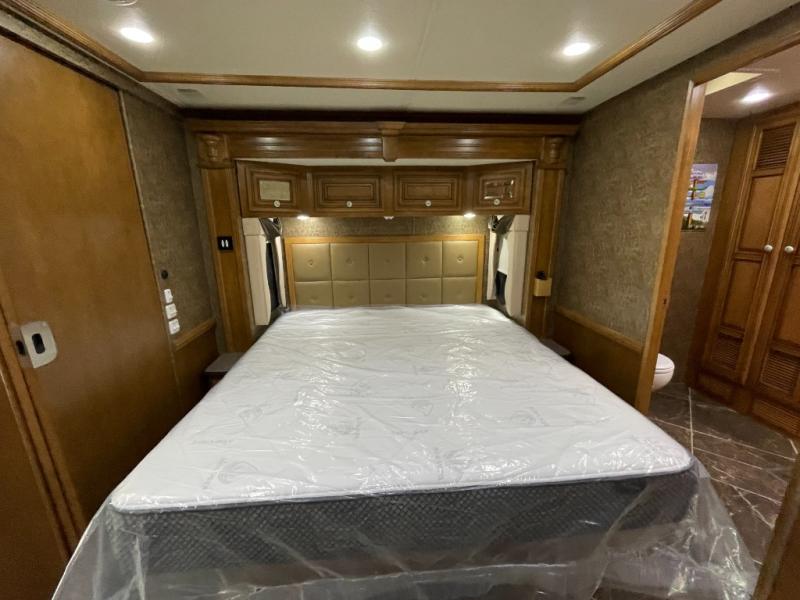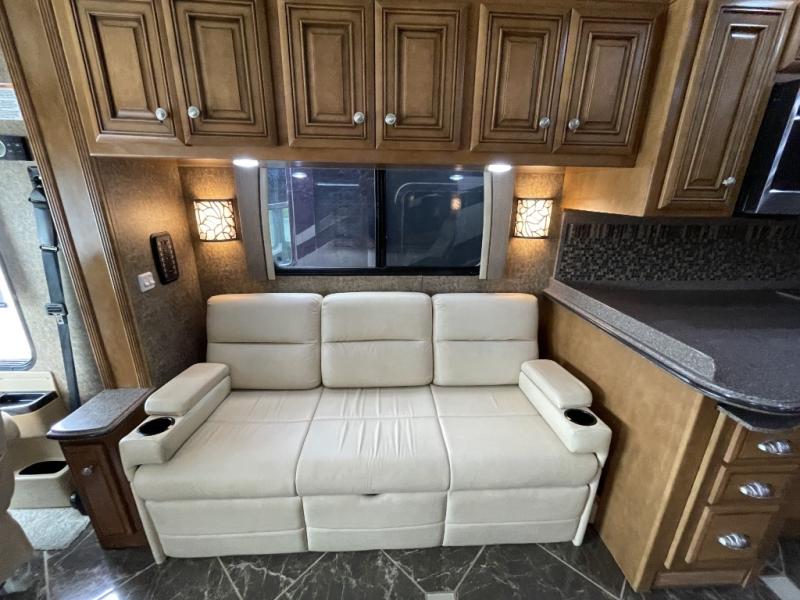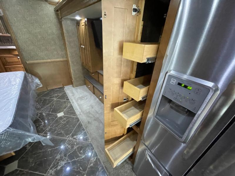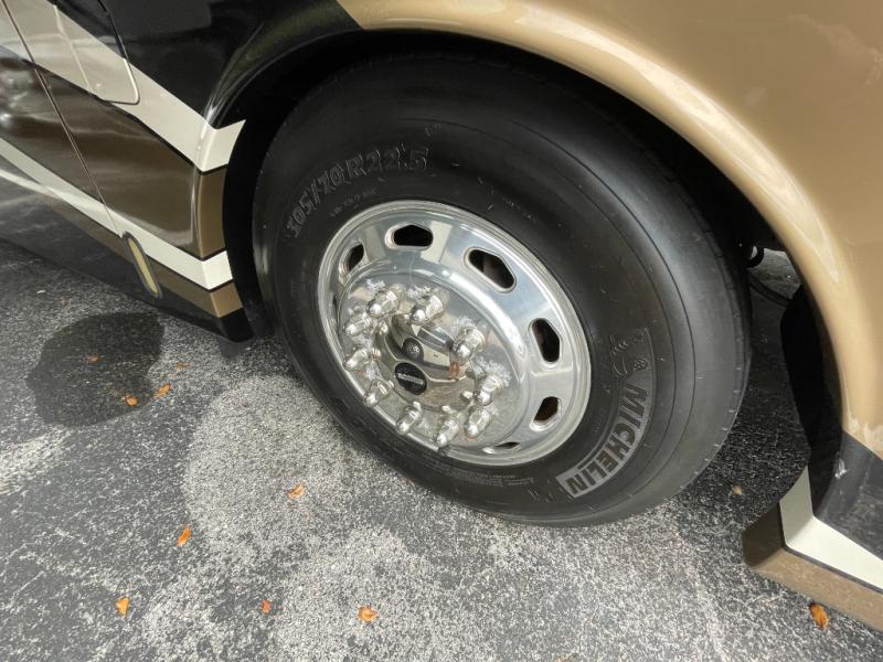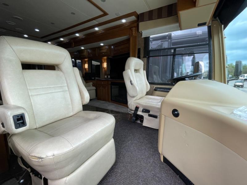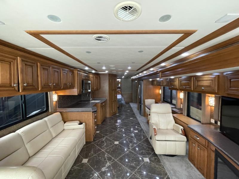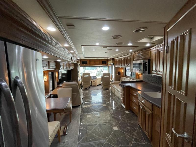 Step inside and you’re welcomed by a luxuriously appointed interior featuring handcrafted hardwood cabinetry, polished solid-surface countertops, and plush residential furnishings. The open floorplan creates a spacious, upscale atmosphere ideal for extended travel or full-time living. Large panoramic windows, elegant lighting, and premium finishes provide a warm, residential feel wherever the road takes you.